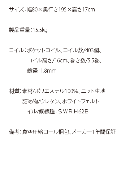 サイズ:幅80×奥行き195×高さ17cm 製品重量:15.5kg コイル:ポケットコイル、コイル数/403個、コイル高さ/16cm、巻き数/5.5巻、線径:1.8mm 材質:素材/ポリエステル100%、ニット生地 詰め物/ウレタン、ホワイトフェルト コイル/鋼線種:SWRH62B 備考:真空圧縮ロール梱包、メーカー1年間保証 カテゴリー:ポケットコイル/マットレス/ポケットコイルマットレス/高品質/低価格/リーズナブル/快眠/安眠/人気/シンプル/モダン/北欧/ナチュラル/保証付き/bed/ベット/白/SALE/セール/安心の1年保証サイズ: 幅80×奥行き195×高さ17cm 製品重量: 15.5kg コイル: ポケットコイル、コイル数/403個、コイル高さ/16cm、巻き数/5.5巻、線径:1.8mm 材質: 素材/ポリエステル100%、ニット生地 詰め物/ウレタン、ホワイトフェルト コイル/鋼線種:SWRH62B 備考: 真空圧縮ロール梱包、メーカー1年間保証