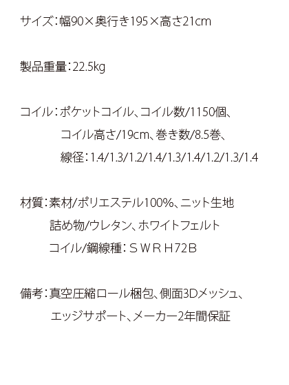 サイズ:幅90×奥行き195×高さ21cm 製品重量:22.5kg コイル:ポケットコイル、コイル数/1150個、コイル高さ/19cm、巻き数/8.5巻、線径:1.4/1.3/1.2/1.4/1.3/1.4/1.2/1.3/1.4 材質:素材/ポリエステル100%、ニット生地 詰め物/ウレタン、ホワイトフェルト コイル/鋼線種:SWRH72B 備考:真空圧縮ロール梱包、側面3Dメッシュ、エッジサポート、メーカー2年間保証 カテゴリー:ポケットコイル/マットレス/ポケットコイルマットレス/高品質/低価格/リーズナブル/快眠/安眠/人気/シンプル/モダン/北欧/ナチュラル/保証付き/bed/ベット/白/サイズ: 幅90×奥行き195×高さ21cm 製品重量: 22.5kg コイル: ポケットコイル、コイル数/1150個、コイル高さ/19cm、巻き数/8.5巻、線径:1.4/1.3/1.2/1.4/1.3/1.4/1.2/1.3/1.4 材質: 素材/ポリエステル100%、ニット生地 詰め物/ウレタン、ホワイトフェルト コイル/鋼線種:SWRH72B 備考: 真空圧縮ロール梱包、側面3Dメッシュ、エッジサポート、メーカー2年間保証