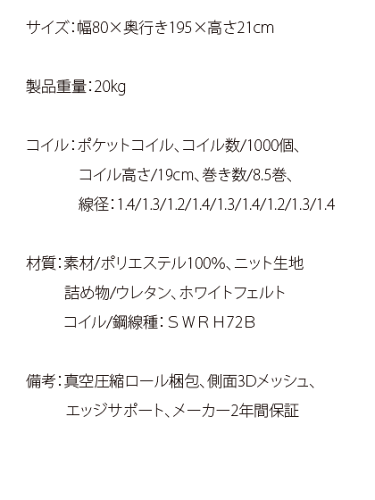 サイズ:幅80×奥行き195×高さ21cm 製品重量:20kg コイル:ポケットコイル、コイル数/1000個、コイル高さ/19cm、巻き数/8.5巻、線径:1.4/1.3/1.2/1.4/1.3/1.4/1.2/1.3/1.4 材質:素材/ポリエステル100%、ニット生地 詰め物/ウレタン、ホワイトフェルト コイル/鋼線種:SWRH72B 備考:真空圧縮ロール梱包、側面3Dメッシュ、エッジサポート、メーカー2年間保証 カテゴリー:ポケットコイル/マットレス/ポケットコイルマットレス/高品質/低価格/リーズナブル/快眠/安眠/人気/シンプル/モダン/北欧/ナチュラル/保証付き/bed/ベット/白/サイズ: 幅80×奥行き195×高さ21cm 製品重量: 20kg コイル: ポケットコイル、コイル数/1000個、コイル高さ/19cm、巻き数/8.5巻、線径:1.4/1.3/1.2/1.4/1.3/1.4/1.2/1.3/1.4 材質: 素材/ポリエステル100%、ニット生地 詰め物/ウレタン、ホワイトフェルト コイル/鋼線種:SWRH72B 備考: 真空圧縮ロール梱包、側面3Dメッシュ、エッジサポート、メーカー2年間保証